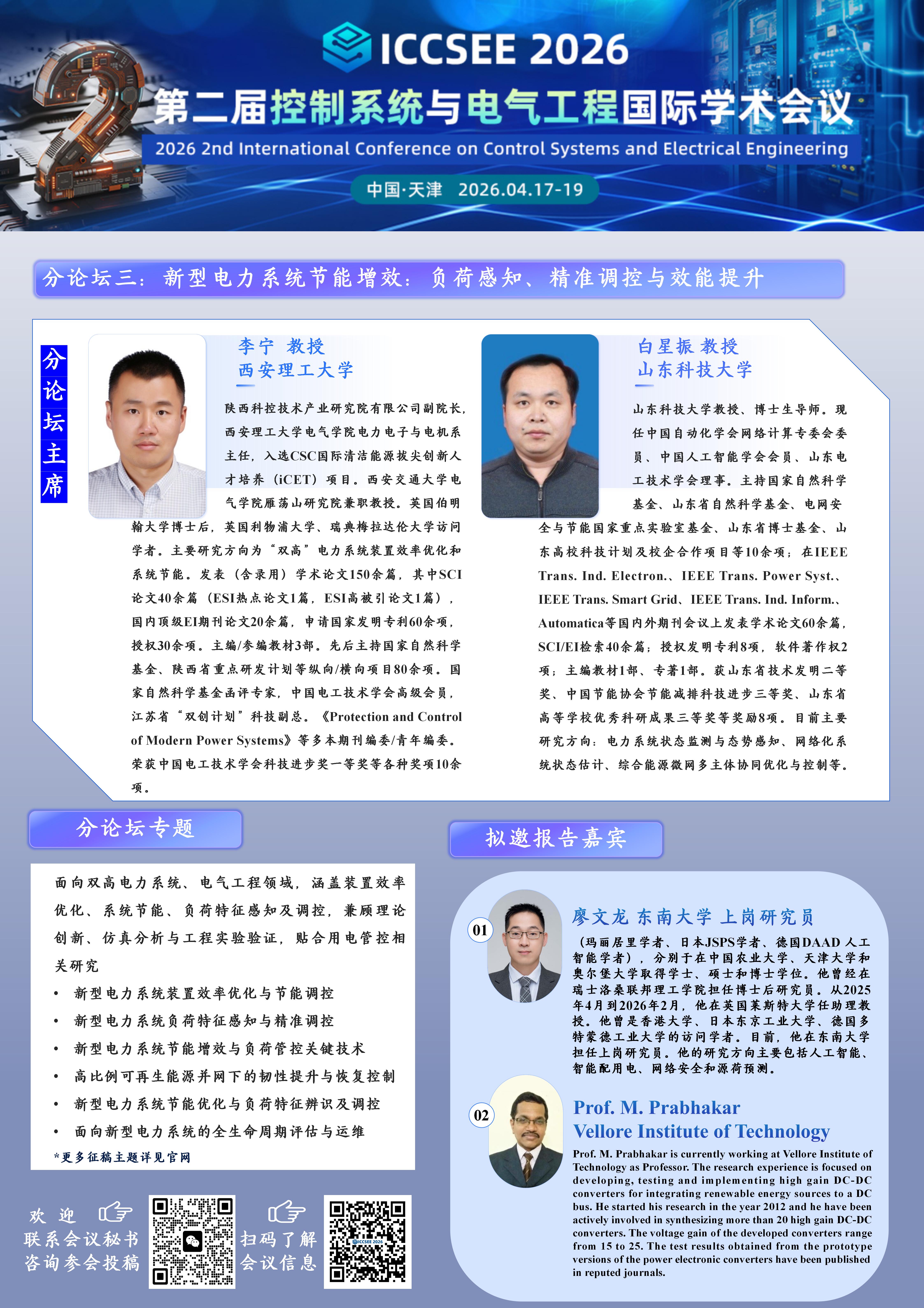 第二届控制系统与电气工程国际学术会议(ICCSEE 2026)将于2026年4月17-19日在中国·天津举办,由兰州交通大学主办,天津大学、广东工业大学、华北电力大学、天津科技大学、武汉大学智能电网研究院、重庆大学、西安理工大学、东北电力大学、宁夏大学、福耀科技大学、山东大学、大连理工大学、天津大学 - 平高储能储能技术联合研究院、日本东京大学、合肥工业大学、南京工程学院、西南交通大学、国家绿色镀膜技术与装备工程技术研究中心等多院校单位协办,澳门科技文化交流协会、RDLink研发家提供支持。