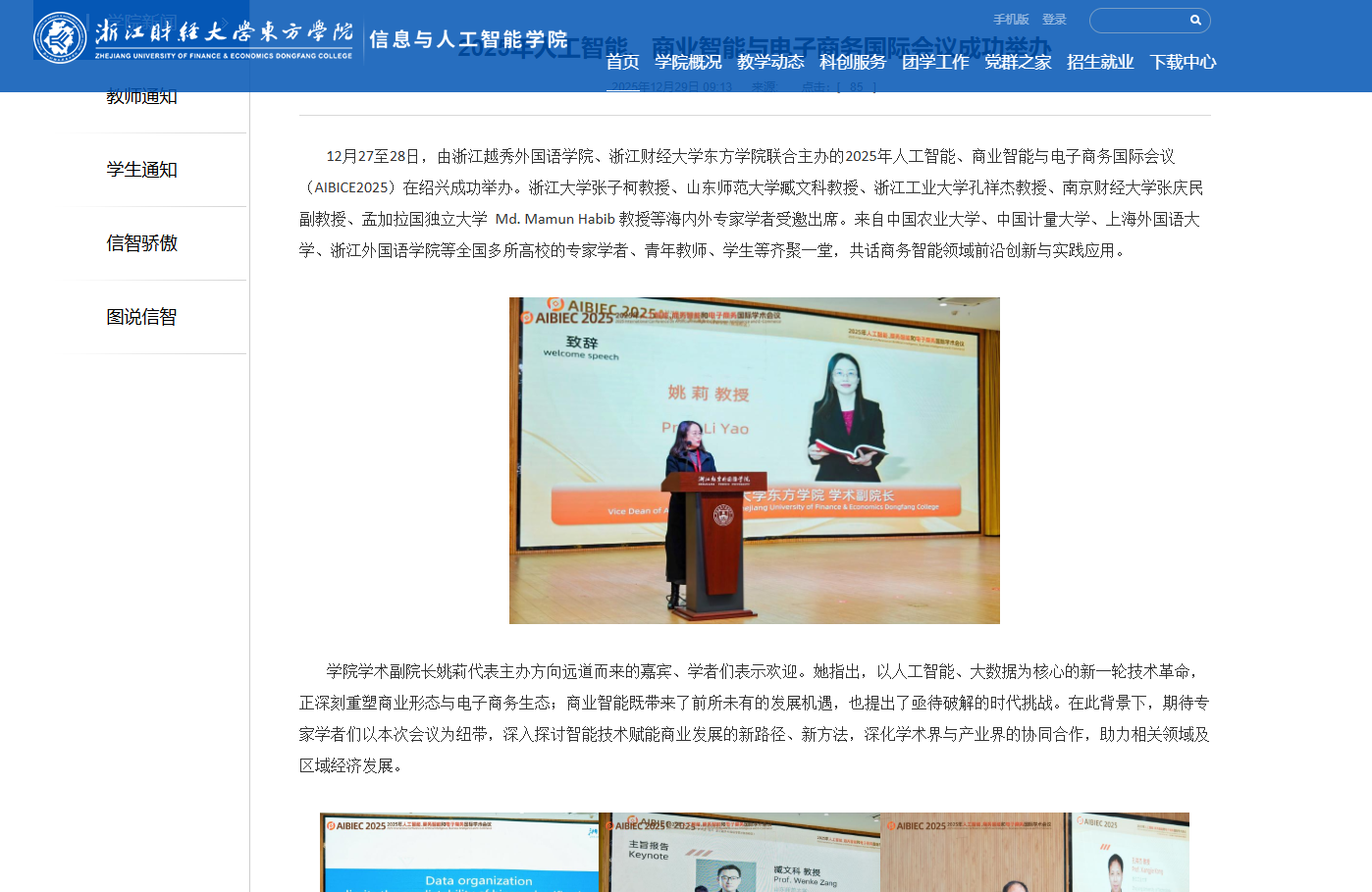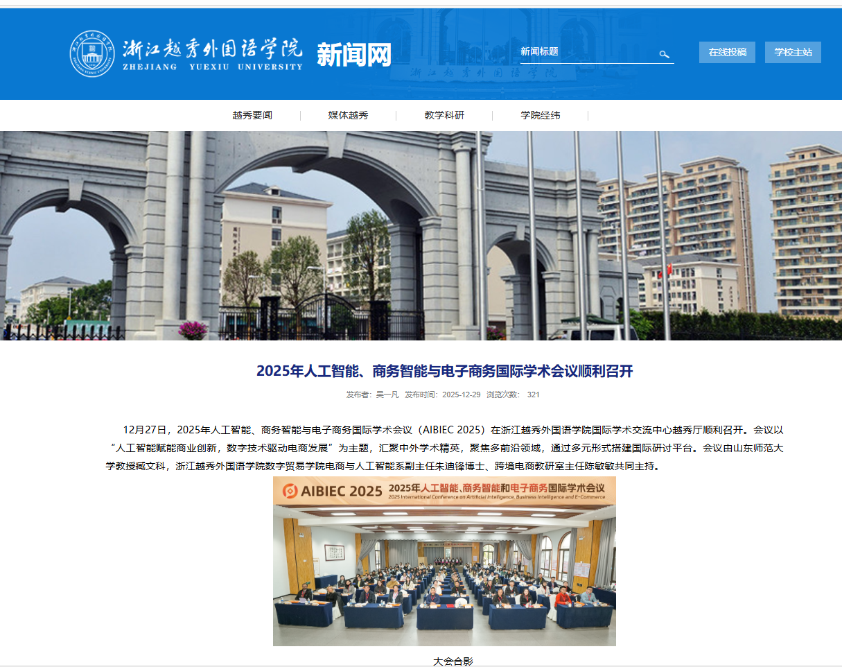 12月27日,2025年人工智能、商务智能与电子商务国际学术会议(AIBIEC 2025)在浙江越秀外国语学院国际学术交流中心越秀厅顺利召开。会议以“人工智能赋能商业创新,数字技术驱动电商发展”为主题,汇聚中外学术精英,聚焦多前沿领域,通过多元形式搭建国际研讨平台。会议由山东师范大学教授臧文科,浙江越秀外国语学院数字贸易学院电商与人工智能系副主任朱迪锋博士、跨境电商教研室主任陈敏敏共同主持。