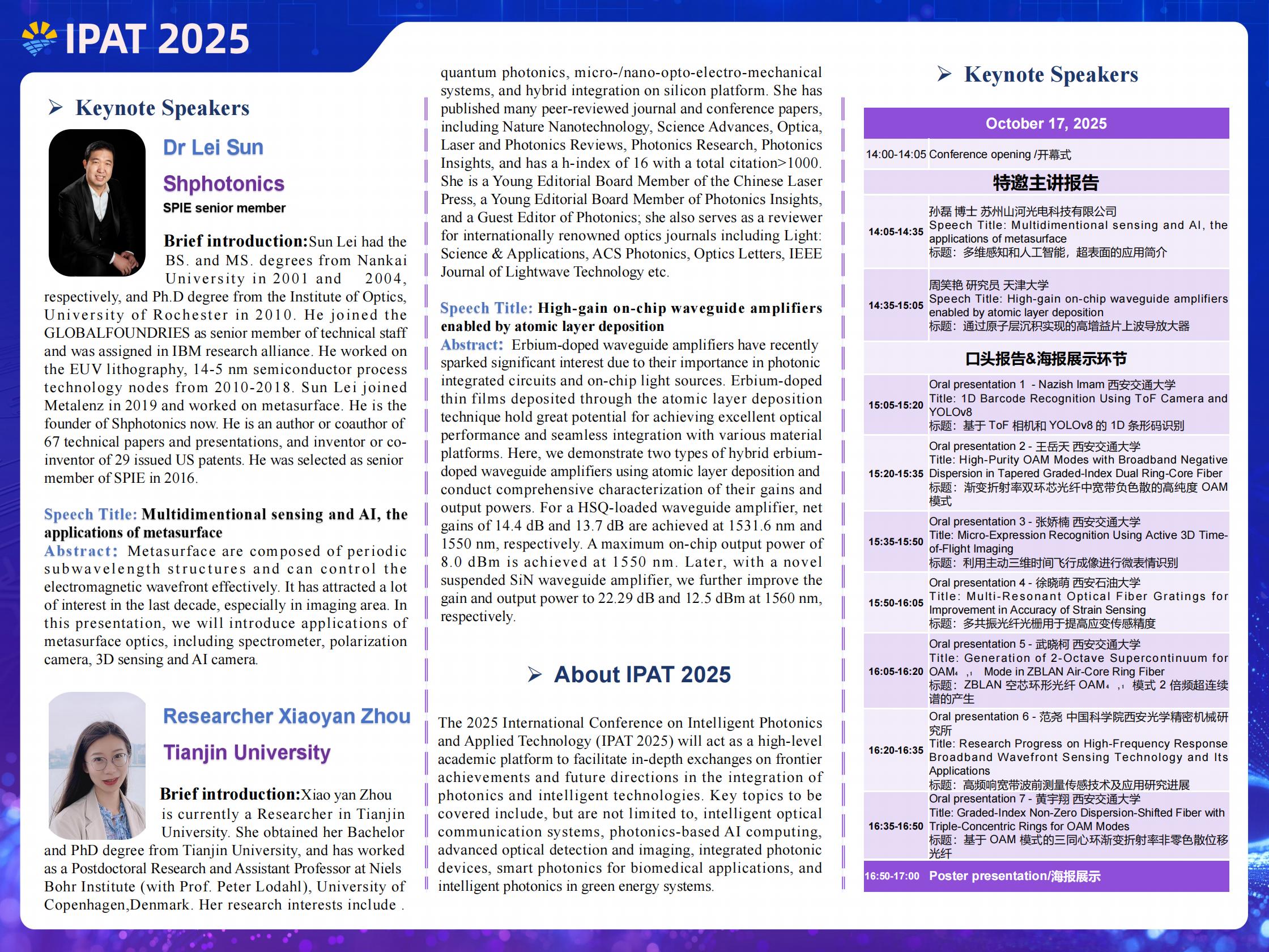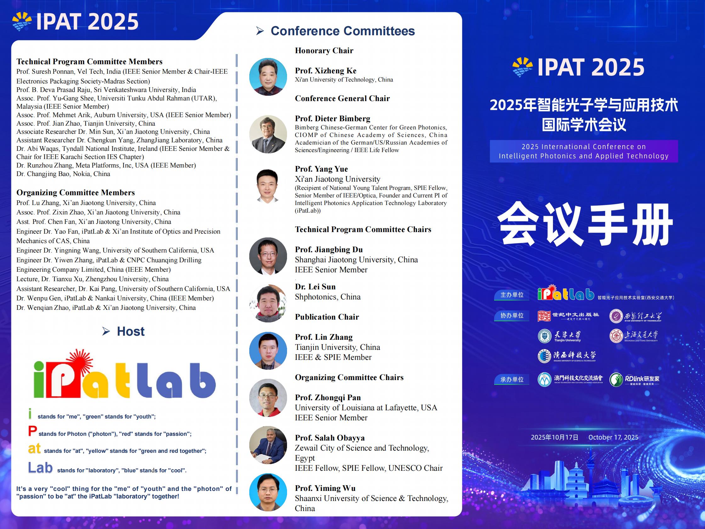 【会议调整通知】经主办方与组委会沟通决定,原定于 10月17-19 日线下举办的【2025年智能光子与应用技术国际学术会议(IPAT 2025)】,调整为 10月17日(周五)线上召开。论文见刊和检索流程不受影响,期待您的参与!