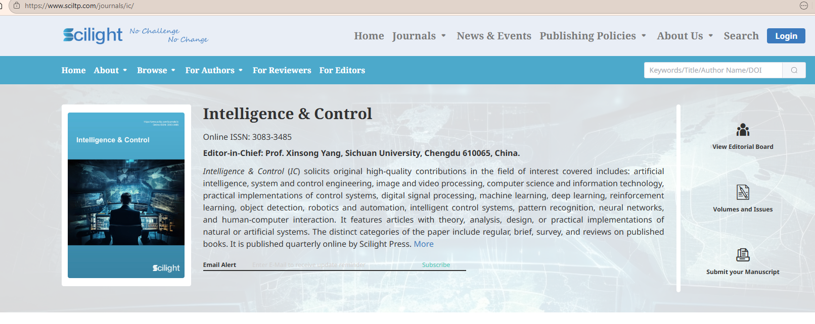 (简称 IC)是由 Scilight Press 出版的金色开放获取英文学术期刊,2025 年创刊,主编为四川大学杨鑫松教授,是聚焦人工智能与控制工程交叉领域的开放获取英文学术期刊,致力于发表智能科学、自动化控制、智能系统、优化决策等方向的原创研究、综述与应用成果。期刊以严谨同行评审、高效出版流程、开放共享传播为宗旨,为国内外科研工作者提供高水平学术交流平台,推动智能技术与控制理论的深度融合与创新发展。