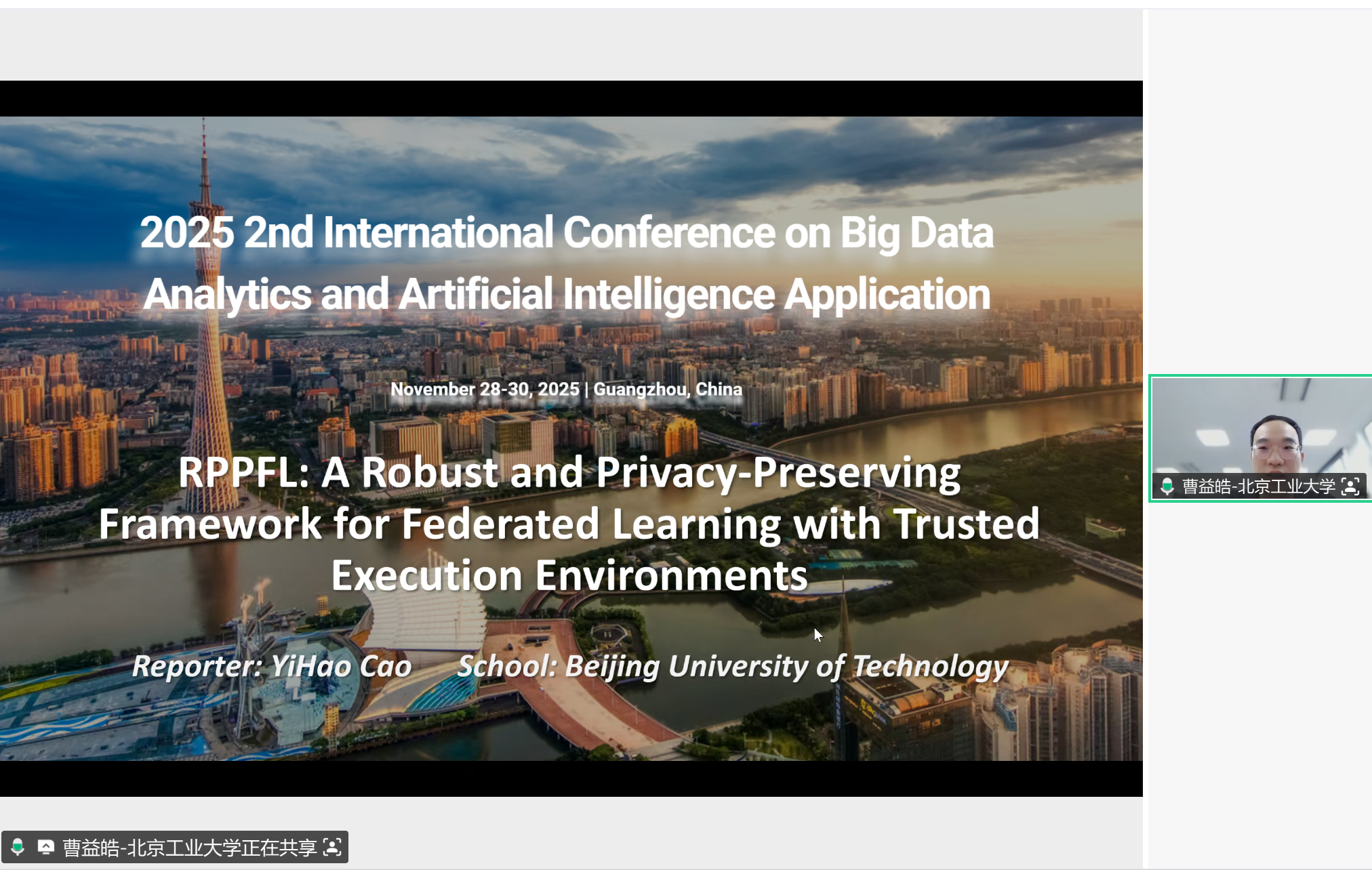 2025 年 11 月 28 日,第二届大数据分析与人工智能应用学术会议(BDAIA2025)以线上形式在广州圆满落幕。本次会议聚焦大数据与人工智能领域的前沿进展,汇聚国内外学界、业界的专家学者与青年研究者,通过多环节学术交流共享领域创新成果,为跨地域的学术沟通搭建了高效平台。