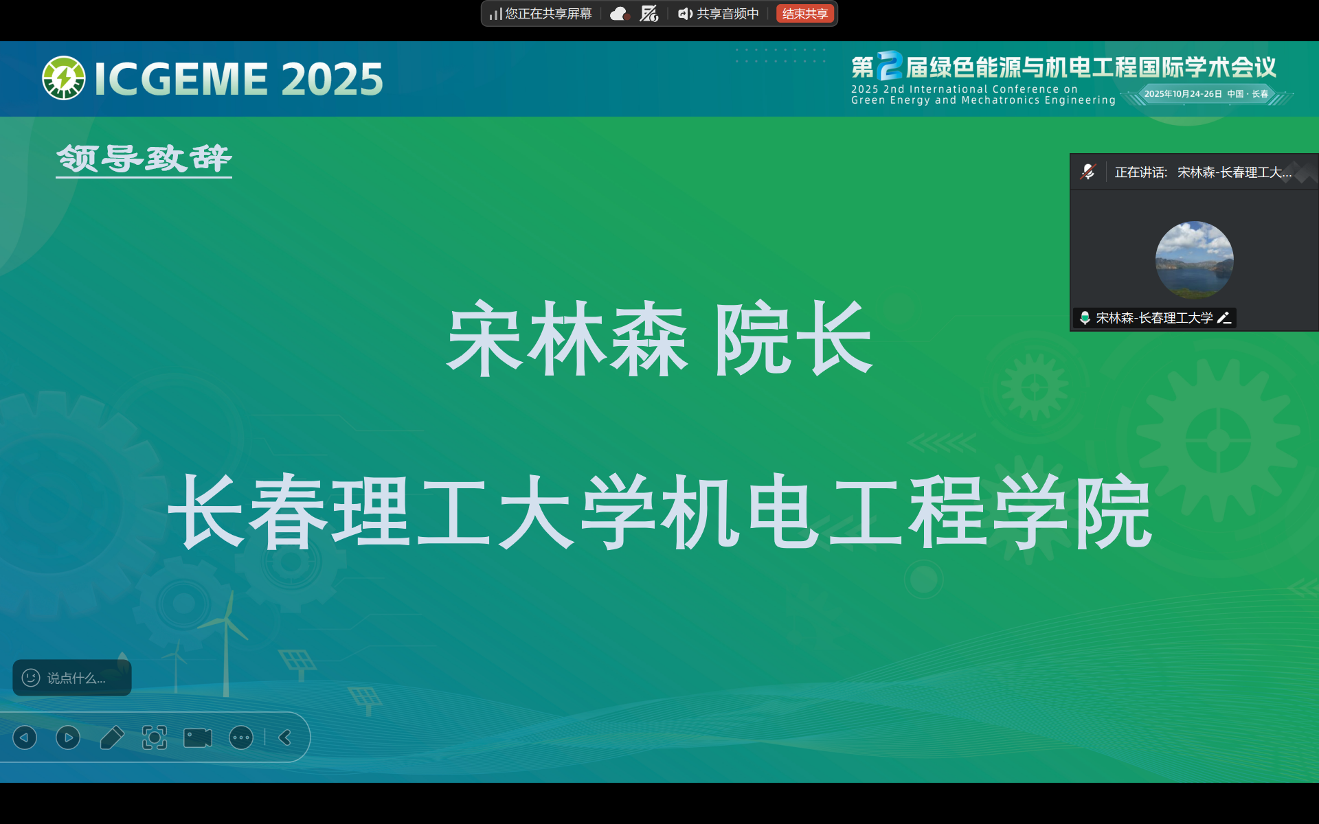 大会开幕式上,会议主席、长春理工大学机电工程学院宋林森院长代表组委会致欢迎辞。他回顾了会议的创办宗旨与首届成果,介绍了学院深厚的学科底蕴与优势,并向各主办单位及会务团队致以谢意。期待通过云端交流推动绿色能源与机电工程领域创新发展,并预祝大会圆满成功。