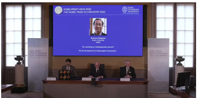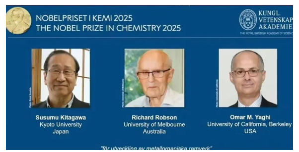2025年10月8日,瑞典皇家科学院宣布,将本年度诺贝尔化学奖授予日本京都大学的北川进(Susumu Kitagawa)特别教授、澳大利亚墨尔本大学的理查德·罗布森(Richard Robson)教授,以及美国加州大学伯克利分校的奥马尔·M·亚基(Omar M. Yaghi)教授,以表彰他们在“金属有机构造体”(Metal–Organic Frameworks,MOF)研究领域的开创性贡献。