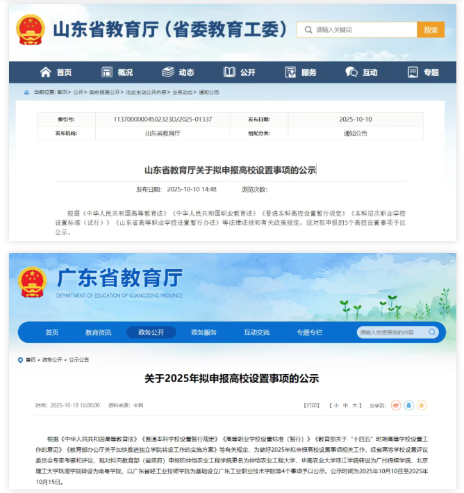 10月9日、10日,安徽省、山东省、广东省教育厅相继发布公示,拟以现有学校为基础新设5所高校,转设2所高校,更名1所高校:
