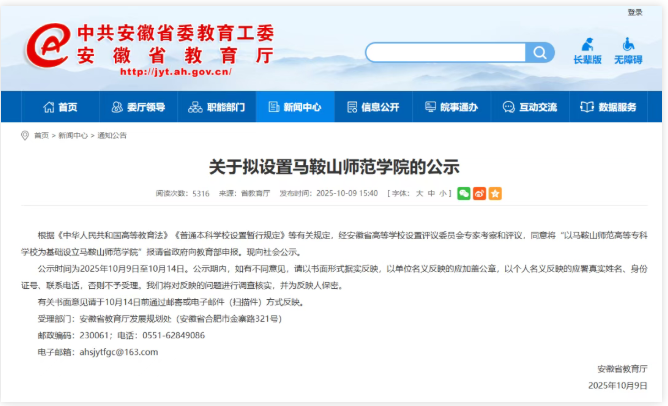 拟以马鞍山师范高等专科学校为基础设立马鞍山师范学院;