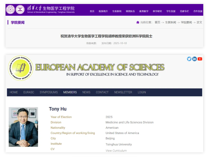 据清华大学官网,近日,欧洲科学院(European Academy of Sciences)公布入选院士名单。清华大学生物医学工程学院院长胡晔当选欧洲科学院院士。