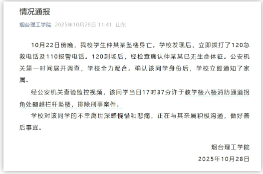 烟台理工学院10月28日通报,10月22日傍晚,学校学生仲某某坠楼身亡。学校发现后,立即拨打了120急救电话及110报警电话。120到场后,经检查确认仲某某已无生命体征。公安机关第一时间展开调查,学校全力配合。确认该同学身份后,学校立即通知了家属。