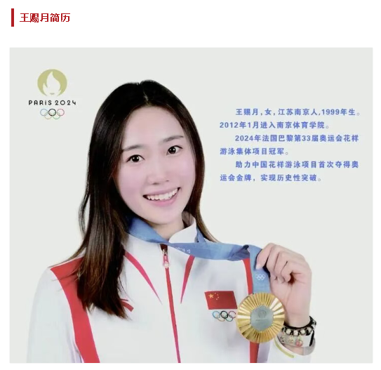 王赐月,1999年11月出生,江苏南京人,2012年1月进入南京体育学院,2014年11月进入江苏省花游队。2022年至2024年,连续3年在国际泳联游泳世锦赛上摘金;2023年获得杭州第19届亚运会集体项目金牌;2024年获得巴黎奥运会花样游泳集体项目金牌,这也是中国花游队首次获得该项目奥运会金牌。