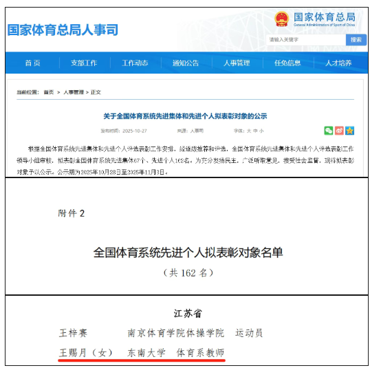 近日,国家体育总局人事司网站发布《关于全国体育系统先进集体和先进个人拟表彰对象的公示》。东南大学体育系教师王赐月位列“全国体育系统先进个人拟表彰对象名单”,这表明,奥运冠军王赐月已入职东南大学。
