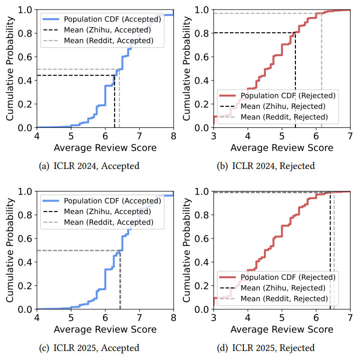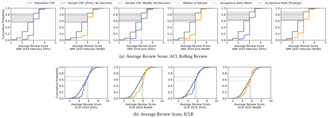 他们以 ICLR 会议为例,绘制了被录用论文和被拒稿论文的总体累积分布函数(CDF),分别用蓝色和红色表示,并在图中标出了知乎和 Reddit 上作者报告的平均分数均值(黑色和灰色虚线),以直观展示线上报告分数在总体分布中的分位位置。