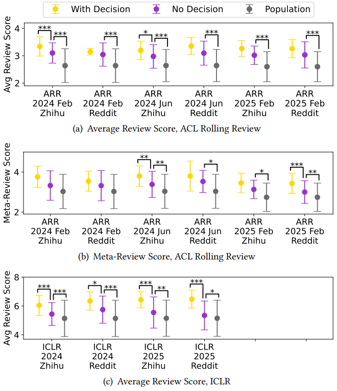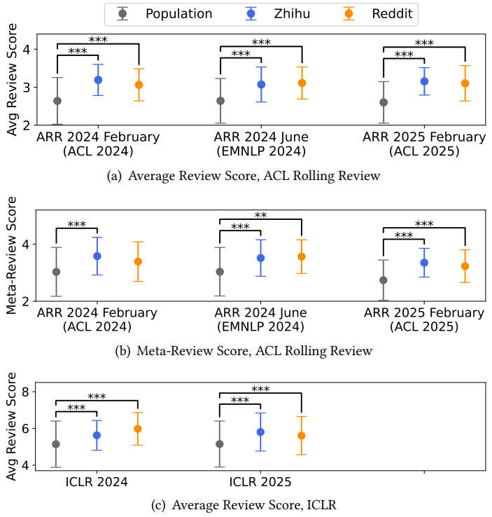 德州农工大学和康奈尔大学的研究团队基于知乎和 Reddit 上关于 ICLR、ACL、EMNLP 等多个顶会的讨论帖定量地验证了这一观点:在线讨论平台上作者分享的审稿分数,并不能代表全局,它们普遍高于真实分布。