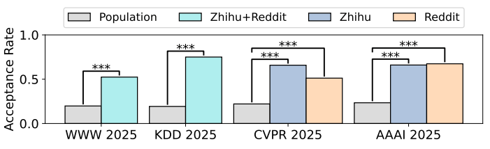 例如在 ACL、EMNLP、ICLR 的知乎和 Reddit 数据中,样本录取率分别是总体录取率的 2.06 倍和 1.87 倍!