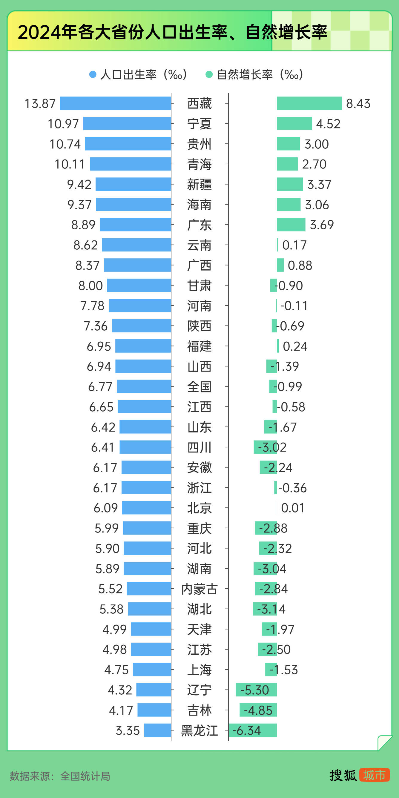 具体到各地,共有10座省份出生率高于全国且自然增长率为正,分别是西藏、宁夏、贵州、青海、新疆、海南、广东、云南、广西和福建。