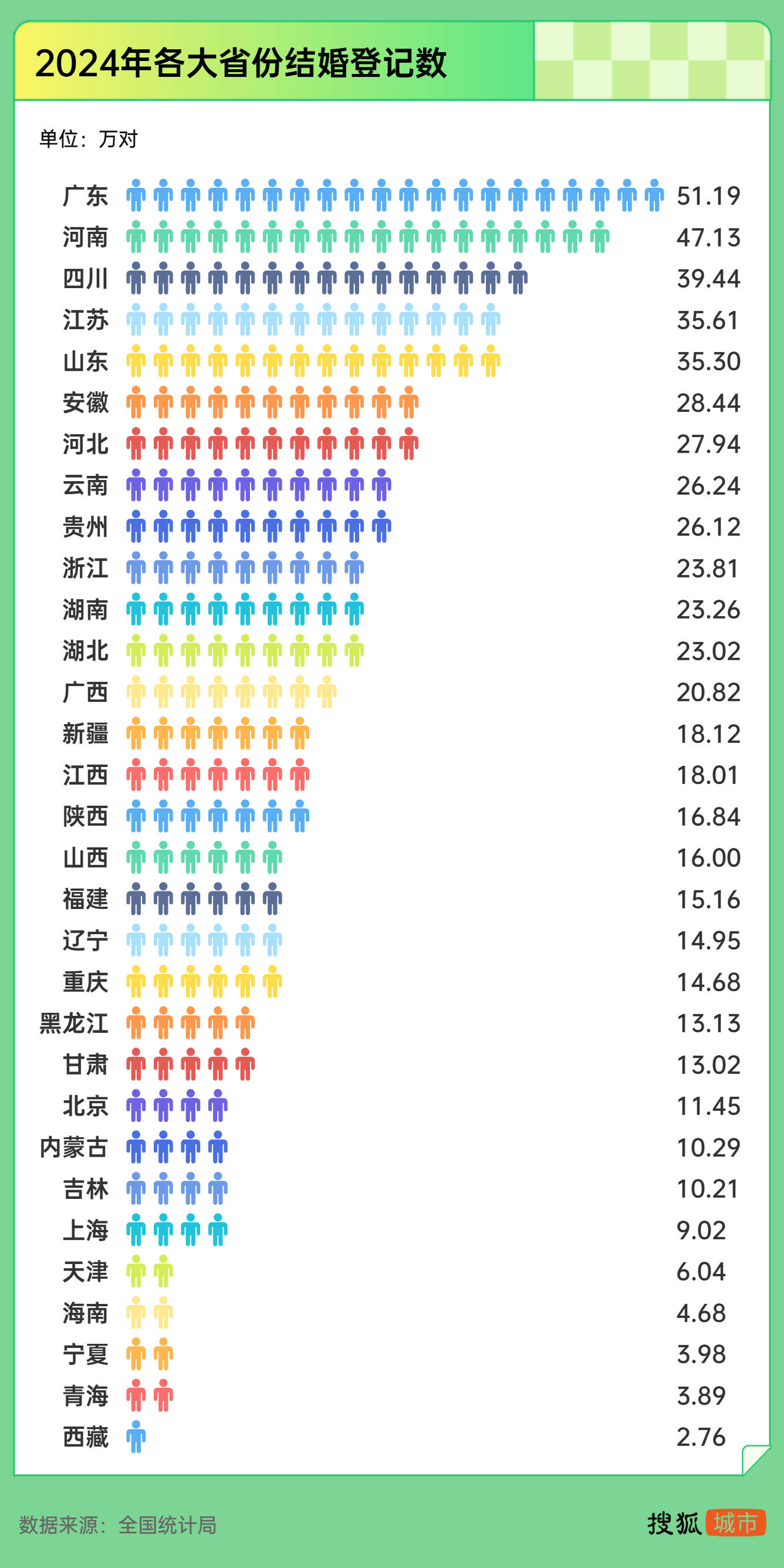 具体到省份,常住人口大省结婚人数最多,广东、河南、四川、江苏、山东高居前五,均超过30万对。广东是唯一一个结婚人数超过50万对的省份,且已连续三年居全国之首,这与其外来人口规模较大、人口结构较为年轻、婚育观念相对保守有关。