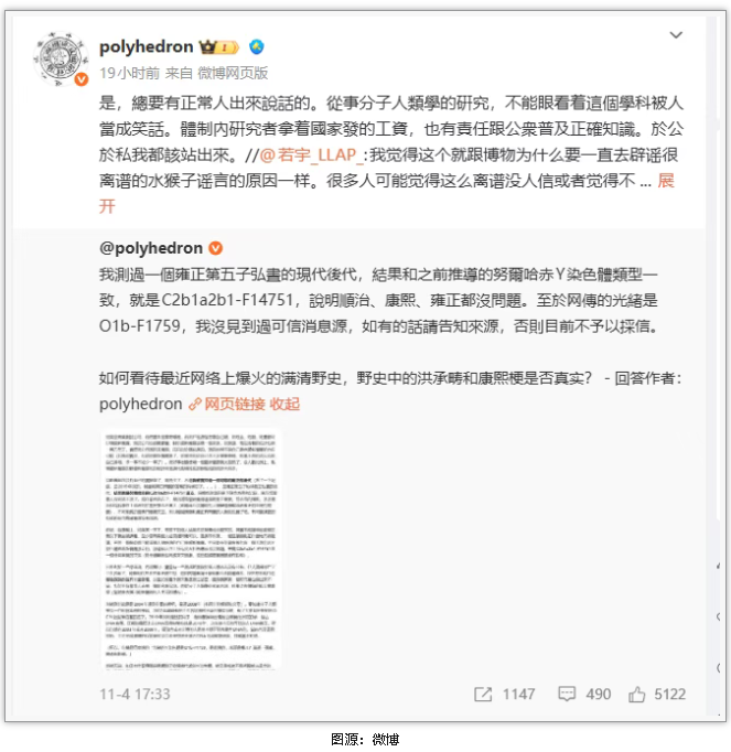 严实副教授还发文评价近日网络爆火的“康熙生父为洪承畴”假说。严实教授是首位通过DNA 研究确定清太祖努尔哈赤 Y 染色体类型的分子人类学研究者。