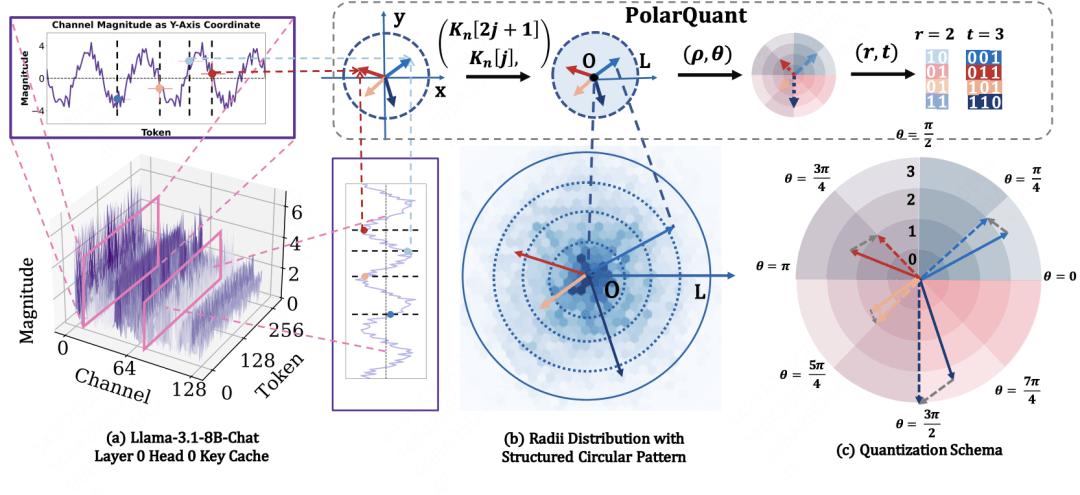 论文简介:随着长上下文生成需求的增加,大语言模型中的KV Cache成为内存消耗瓶颈。现有量化方法在Key Cache上常因异常值问题导致性能不足。PolarQuant提出一种全新视角的量化方法:通过极坐标变换发现Key向量在半径与角度空间中呈现规律分布,异常值仅出现在单维度。PolarQuant将Key向量划分为二维子向量,以量化半径和角度的方式替代直接量化原始向量,有效缓解异常值问题。进一步,PolarQuant将Query-Key内积转化为查表操作,实现KV Cache量化的高效性与解码加速,同时保持与全精度模型一致的下游性能。