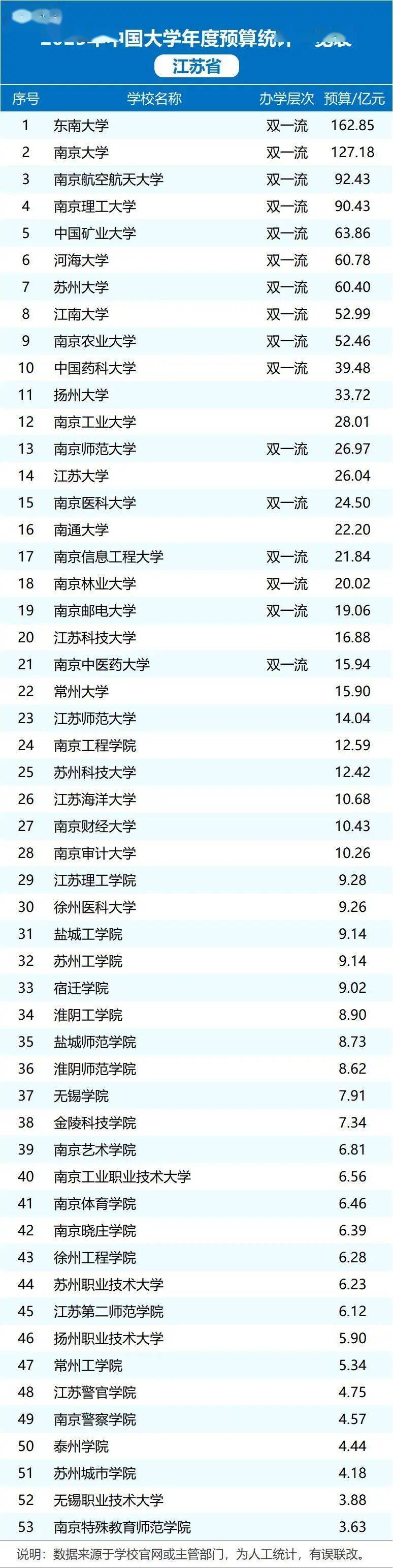 2025年江苏省高校预算排名出炉,展现了高校教育资源的全新布局。东南大学以162.85亿元位居榜首,南京大学以127.18亿元紧随其后,双一流高校均稳居前列。令人瞩目的是,江南大学(江大)预算达52.99亿元,小幅超过南京农业大学的52.46亿元,位列第8位。江苏科技大学(江科大)位居第20位,预算16.88亿元,展现出稳进态势。泰州学院则以4.44亿元跻身第50位,突显地方高校的奋进步伐。全省高校整体预算分配优化,强化了教育协同效应,推动产学研深度融合。