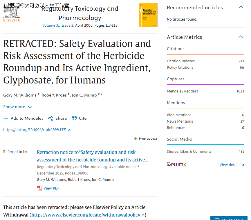 这不仅仅是一次学术界的勘误,更是一场动摇全球农药安全基石的八级地震。2025年12月5日,知名学术期刊《监管毒理学与药理学》主编马丁·范登伯格痛下决心,正式撤回了一篇发表于2000年的重磅研究。