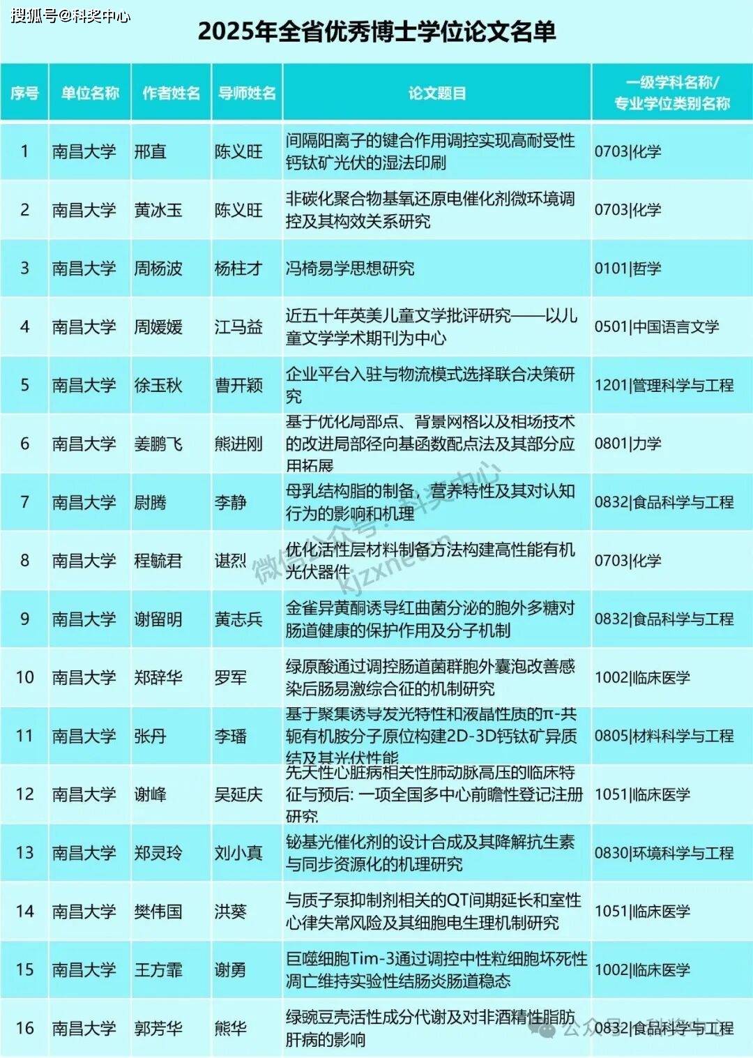 根据江西省人民政府学位委员会办公室《关于开展2025年全省优秀博士硕士学位论文评选工作的通知》(赣学位办〔2025〕3号)要求,省学位办组织开展了2025年全省优秀博士、硕士学位论文评选工作。经各研究生培养单位推荐,省学位办组织专家通讯评议,共评选出优秀博士学位论文80篇,优秀硕士学位论文487篇。现将名单予以公示 (附件1、2)。