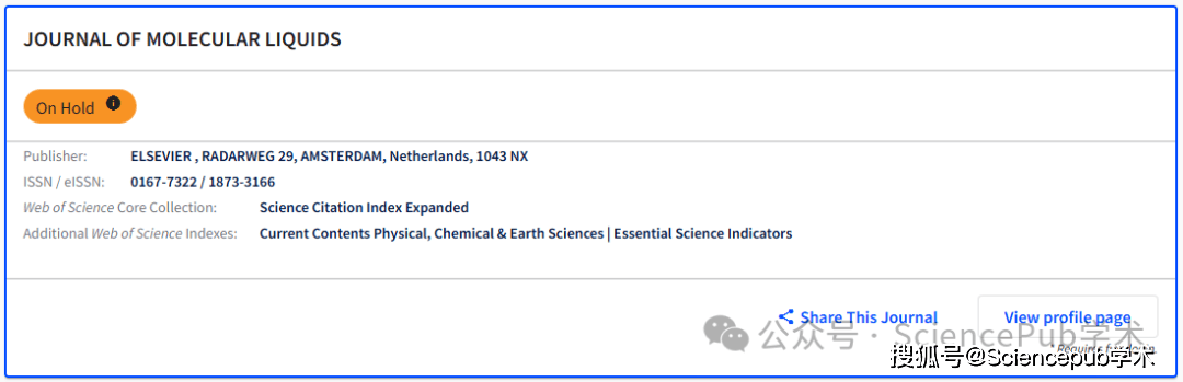 紧急避雷!此前一直被On Hold的中科院2区期刊《Journal of Molecular Liquids》近日在官网发布一则关于【维护研究诚信与出版伦理的声明】——该刊已于近日正式被踢出SCI数据库!