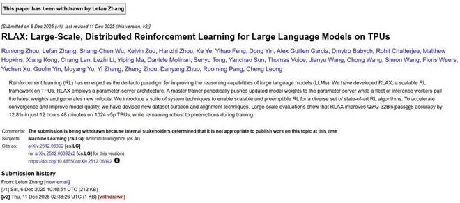 不过观看其提交历史,可以看到该论文在 12 月 6 日(UTC)就已被提交到 arXiv,到 11 号已经过去了 5 天,公开上线之后却又被光速撤稿,这不由得地让人好奇究竟发生了什么。