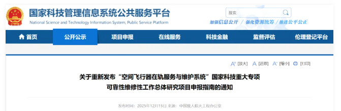 依据国家科技重大专项有关管理规定,根据“空间飞行器在轨服务与维护系统”国家科技重大专项实施方案部署,现将项目申报指南重新予以公布(详见附件1)。本次申报采用公开发布方式遴选项目承担单位,请按照指南要求组织项目申报工作,有关事项通知如下。