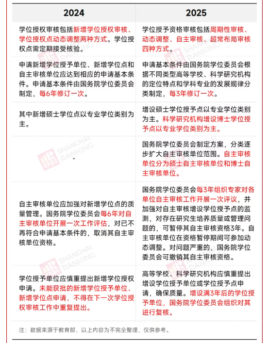 与2024版《博士硕士学位授予资格审核办法》对比,2025版部分新变化如下: