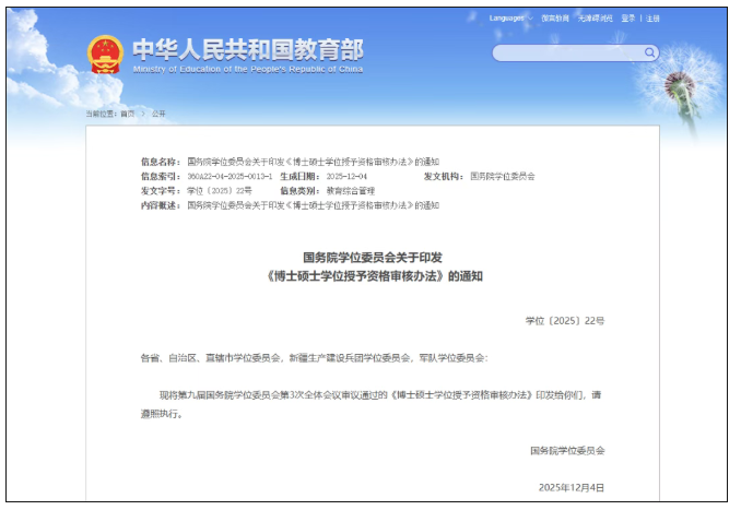 12月25日,第九届国务院学位委员会第3次全体会议审议通过的《博士硕士学位授予资格审核办法》正式印发。