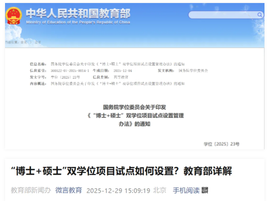 近日,国务院学位委员会印发了《“博士+硕士”双学位项目试点设置管理办法》(以下简称《办法》)(办法全文详见文末)。