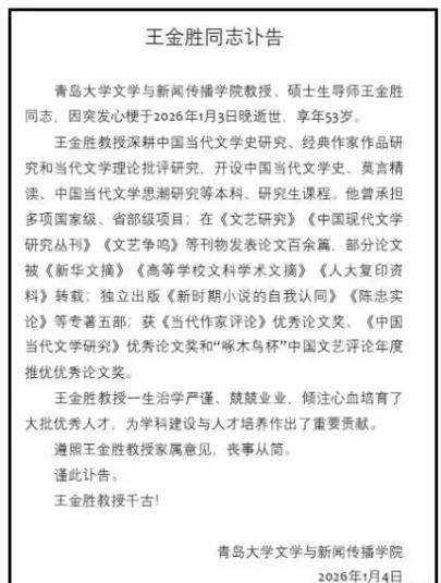 2026 年 1 月 3 日晚,青岛大学文学与新闻传播学院教授、硕士生导师王金胜因突发疾病与世长辞,年仅 53 岁。消息传来,学界同仁、师生及社会各界人士无不为之震惊与悲痛。青岛大学相关部门及学院工作人员第一时间证实了这一噩耗,让人们在新年伊始便感受到生命的脆弱与无常。