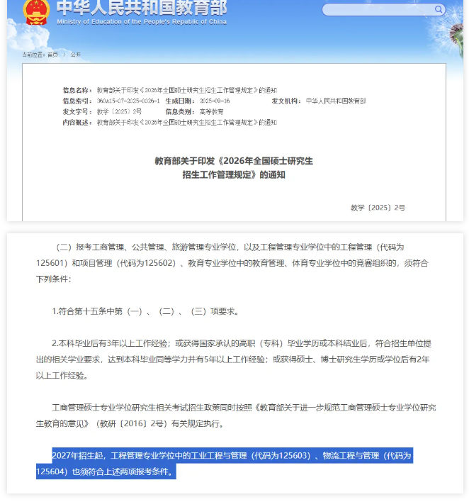 研招网资讯1月7日发文,提醒备战2027年研考的同学注意一项调整:教育部此前发布的《2026年全国硕士研究生招生工作管理规定》提到,自2027年招生起,报考工程管理专业学位中的工业工程与管理(代码:125603)、物流工程与管理(代码:125604),须符合文件中规定的相关报考条件。