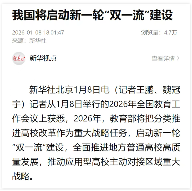 新华社北京1月8日电,记者从1月8日举行的2026年全国教育工作会议上获悉,2026年,教育部将把分类推进高校改革作为重大战略任务,启动新一轮“双一流”建设,全面推进地方普通高校高质量发展,推动应用型高校主动对接区域重大战略。