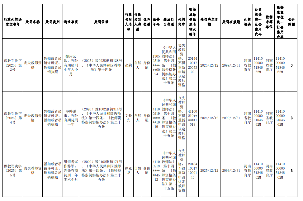 2025年12月31日,河南省教育厅发布“2025年撤销高校教师资格行政处罚” 的通报。通报对五名教师做出了撤销或丧失教师资格的处理。