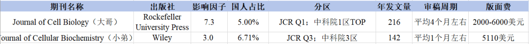 在投稿选择方面,如果文章创新性高或者数据量足够大,并且个人也比较追求期刊的老牌名声,同时不急于发表,那么不妨试一把大哥 Journal of Cell Biology(JCB);如果更加注重发表速度,那么则可以投稿难度相对较低的小弟Journal of Cellular Biochemistry(小 JCB)。