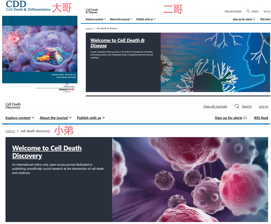 如果你选的是 A,那么恭喜你目前的选刊能力处在巅峰导师水平;如果选的是 B,那也不错,至少也有个博士水平;如果你选的是 C 的话,那可能还得加把劲啦!事实上,上述三本都可以称之为 CDD,但是也分个三六九等,其中 Cell Death and Differentiation被称为大哥,Cell Death & Disease被称作二哥,Cell Death Discovery 则是小弟!那么,区分它们都有哪些要点呢?