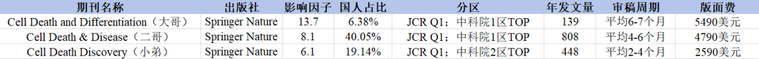 这 3 本期刊同出自 Nature旗下,名字均以「Cell Death」开头,目前 IF 从高到低依次为Cell Death and Differentiation、Cell Death & Disease、Cell Death Discovery。从影响因子来看,大哥 Cell Death and Differentiation 最高,已经超过 10 分,当然版面费也是最高的。