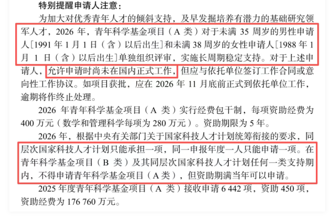加大对优秀青年人才的倾斜支持,2026年青年科学基金项目(A类)推出特殊支持政策: