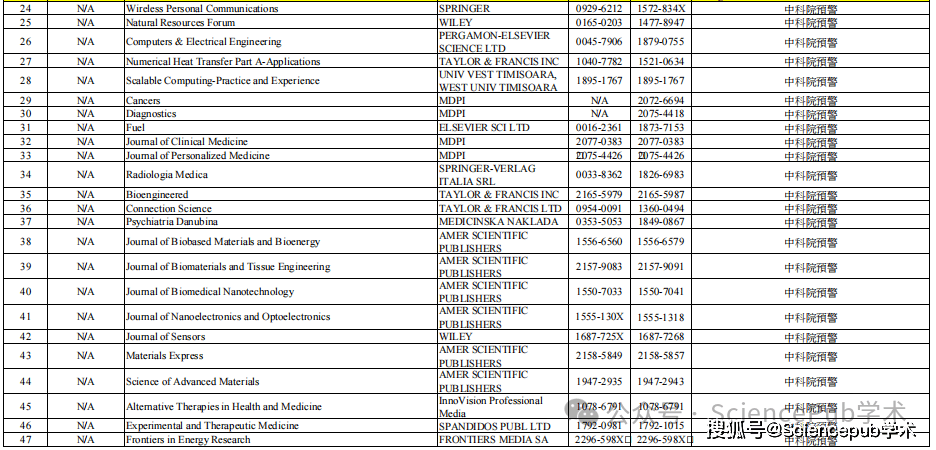 预警期刊目录 Early Warning Journal List