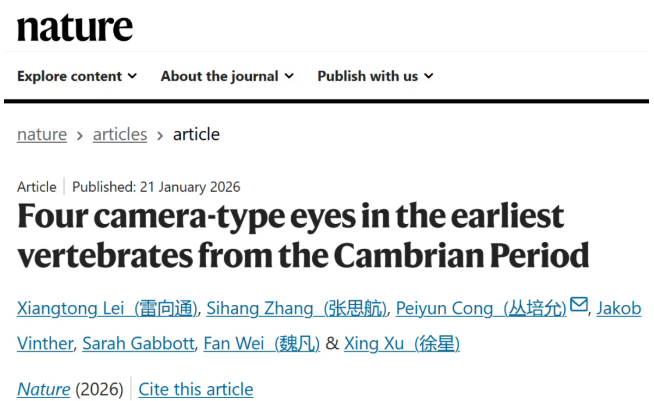2026年1月21日,云南大学生命科学学院脊椎动物演化中心徐星院士团队联合古生物研究院丛培允团队在Nature在线发表题为“Four camera-type eyes in the earliest vertebrates from the Cambrian Period”的研究论文,该研究证实寒武纪最早的脊椎动物有四只相机型的眼睛。