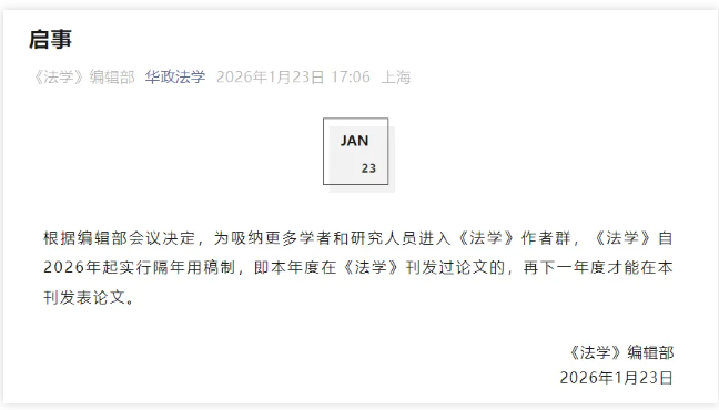 1月23日,《法学》编辑部发布启事称:根据编辑部会议决定,为吸纳更多学者和研究人员进入《法学》作者群,《法学》自2026年起实行隔年用稿制,即本年度在《法学》刊发过论文的,再下一年度才能在本刊发表论文。