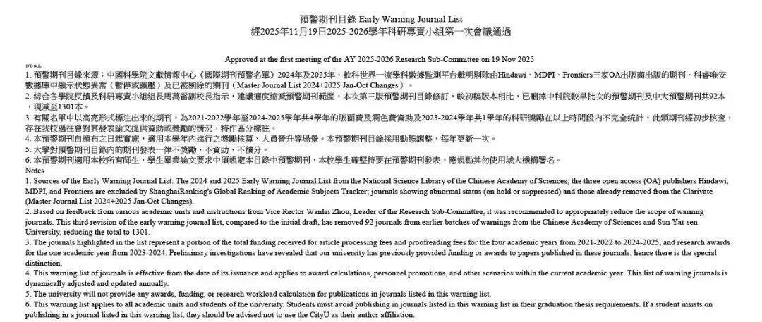 澳门城市大学对预警期刊目录内的期刊做出了十分严厉的措施,即发表一律不奖励、不资助、不积分。