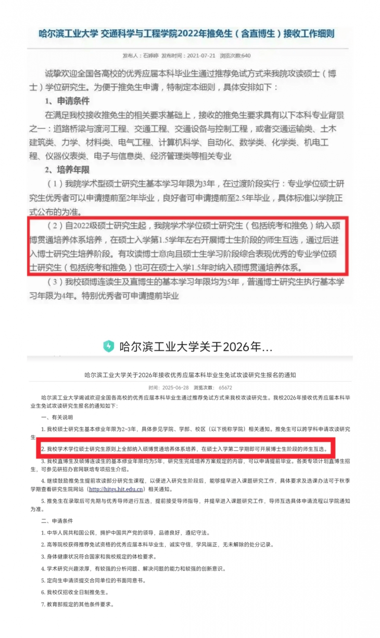 加上,某工信部直属高校发布《关于2026年接收优秀应届本科毕业生免试攻读研究生报名的通知》,明确提到:“全校学术学位硕士研究生原则上全部纳入硕博贯通培养体系培养,在硕士入学第二学期即可开展博士生阶段的师生互选;全校直博生及硕博连读生的基本修业年限均为5年。”