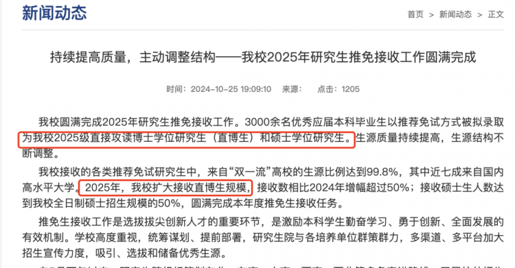2025年武汉大学进一步扩大接收直博生规模,接收数相比2024年增幅超过50%。