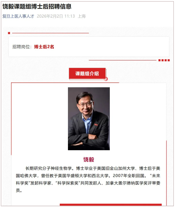 2026年2月2日,复旦大学上海医学院的官方账号“复旦上医人事人才”,发布了一则公告——63岁的饶毅教授,正式加盟复旦上医。这也终于让这位前首都医科大学校长,卸任后的新动向尘埃落定:换个地方继续深耕科研,初心未改。
