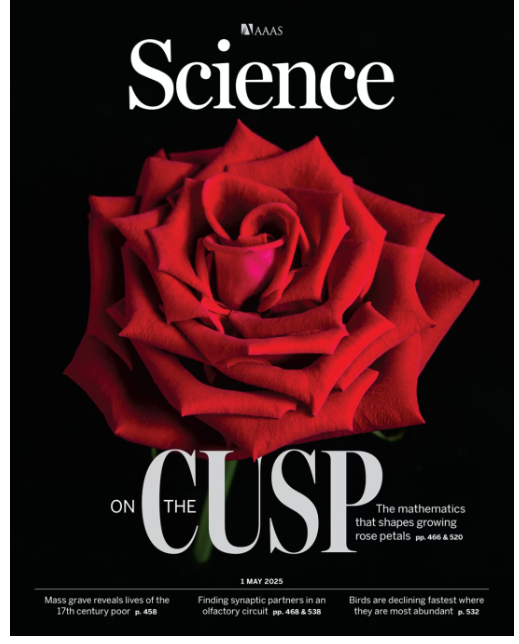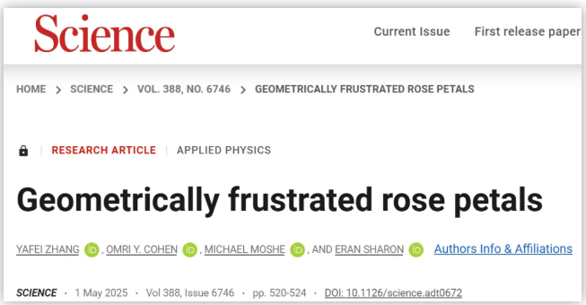 2025年5月1日,以色列耶路撒冷希伯来大学Eran Sharon团队(张亚飞为第一作者)在Science 以封面的形式在线发表题为“Geometrically frustrated rose petals”的研究论文,该研究发现在玫瑰花瓣生长过程中沿其边缘形成的局部尖峰的形成是由Mainardi-Codazzi-Peterson不相容性所驱动的。
