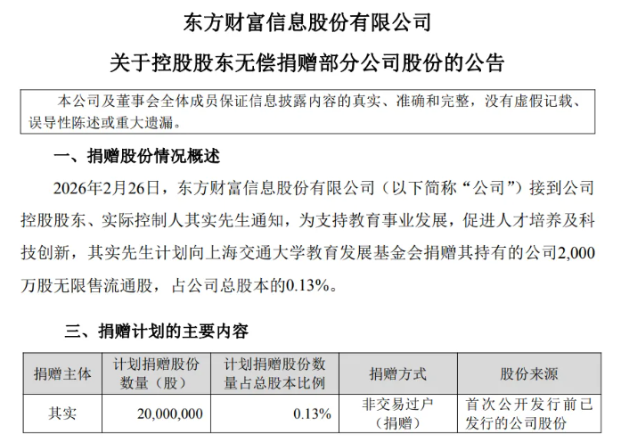 2月26日,东方财富信息股份有限公司发布公告称,公司控股股东、实际控制人其实计划向上海交通大学教育发展基金会捐赠其持有的公司2000万股无限售流通股,占公司总股本的0.13%。截至当日收盘,东方财富报22.50元/股,据此粗略估算,所捐赠的2000万股对应市值4.5亿元。