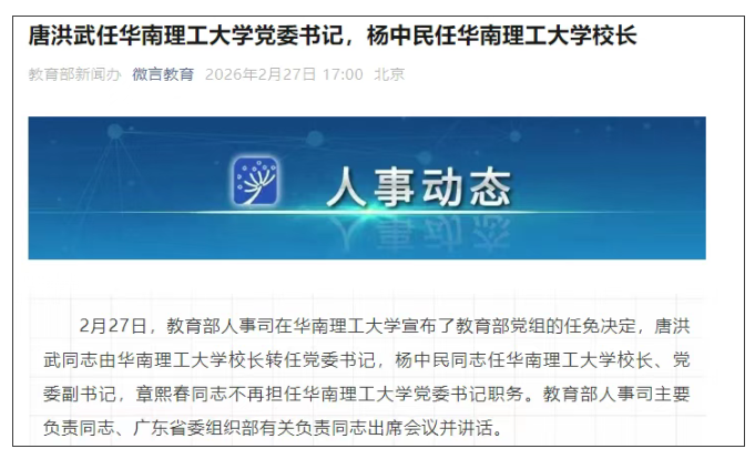 2月27日,教育部人事司在华南理工大学宣布了教育部党组的任免决定,唐洪武同志由华南理工大学校长转任党委书记,杨中民同志任华南理工大学校长、党委副书记,章熙春同志不再担任华南理工大学党委书记职务。教育部人事司主要负责同志、广东省委组织部有关负责同志出席会议并讲话。