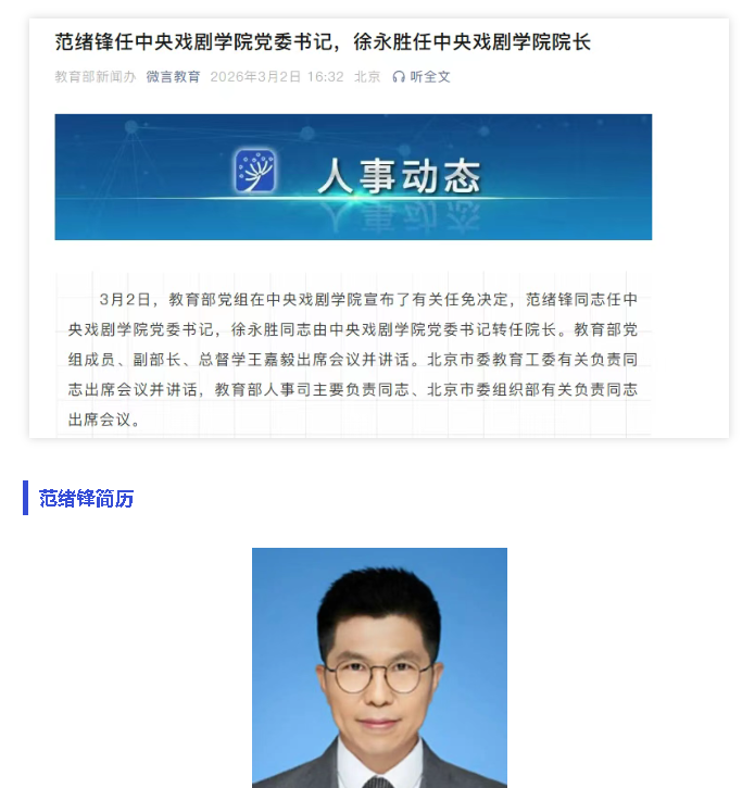 3月2日,教育部党组在中央戏剧学院宣布了有关任免决定,范绪锋同志任中央戏剧学院党委书记,徐永胜同志由中央戏剧学院党委书记转任院长。教育部党组成员、副部长、总督学王嘉毅出席会议并讲话。北京市委教育工委有关负责同志出席会议并讲话,教育部人事司主要负责同志、北京市委组织部有关负责同志出席会议。