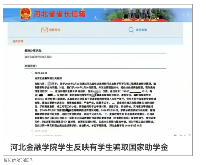 据极目新闻报道,3月23日,有网友称河北金融学院有学生以虚构贫困名义骗取国家助学金。