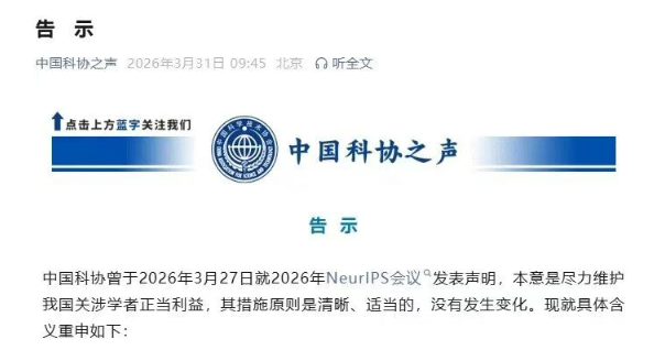 继 2026 年 3 月 27 日发布相关声明后,中国科协于 3 月 31 日再度发布告示,对 2026 年 NeurIPS 会议涉及的参会资助、论文发表、成果认定等事项作出重申。公告明确,原有政策措施原则保持不变,本次重点对具体内涵予以细化解读,既维护学者正当学术权益,也进一步规范项目资助与成果评价标准。